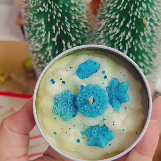 frozen whisper candle, apple cinnamon candle, winter candle India, soy wax candle, luxury scented candles, Christmas candles, handcrafted candles, festive home fragrance, snowflake candle, LushGlow candles