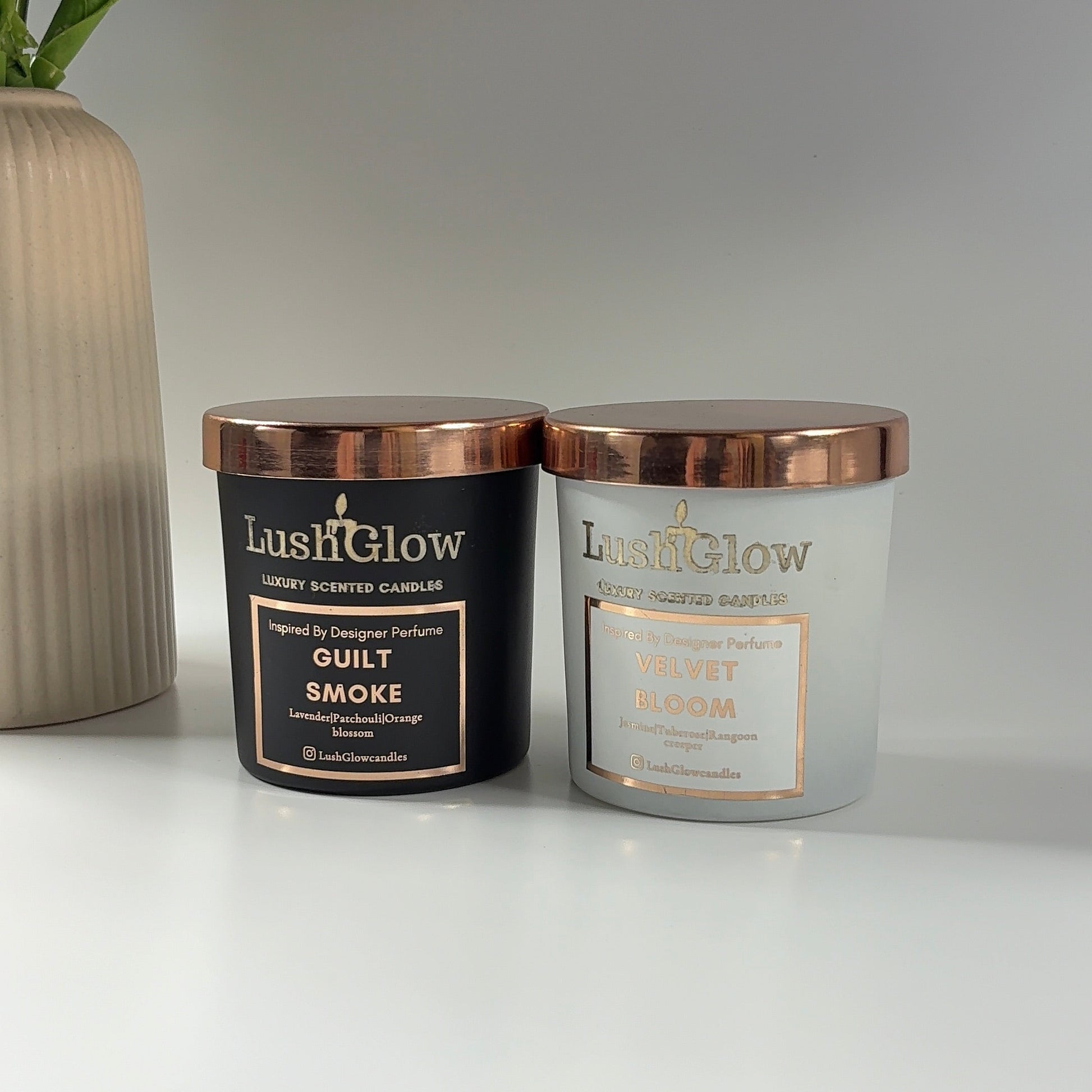 LushGlow Candle Set – Him & Her | Velvet Bloom & Guilt Smoke | Luxury Soy Gift Duo